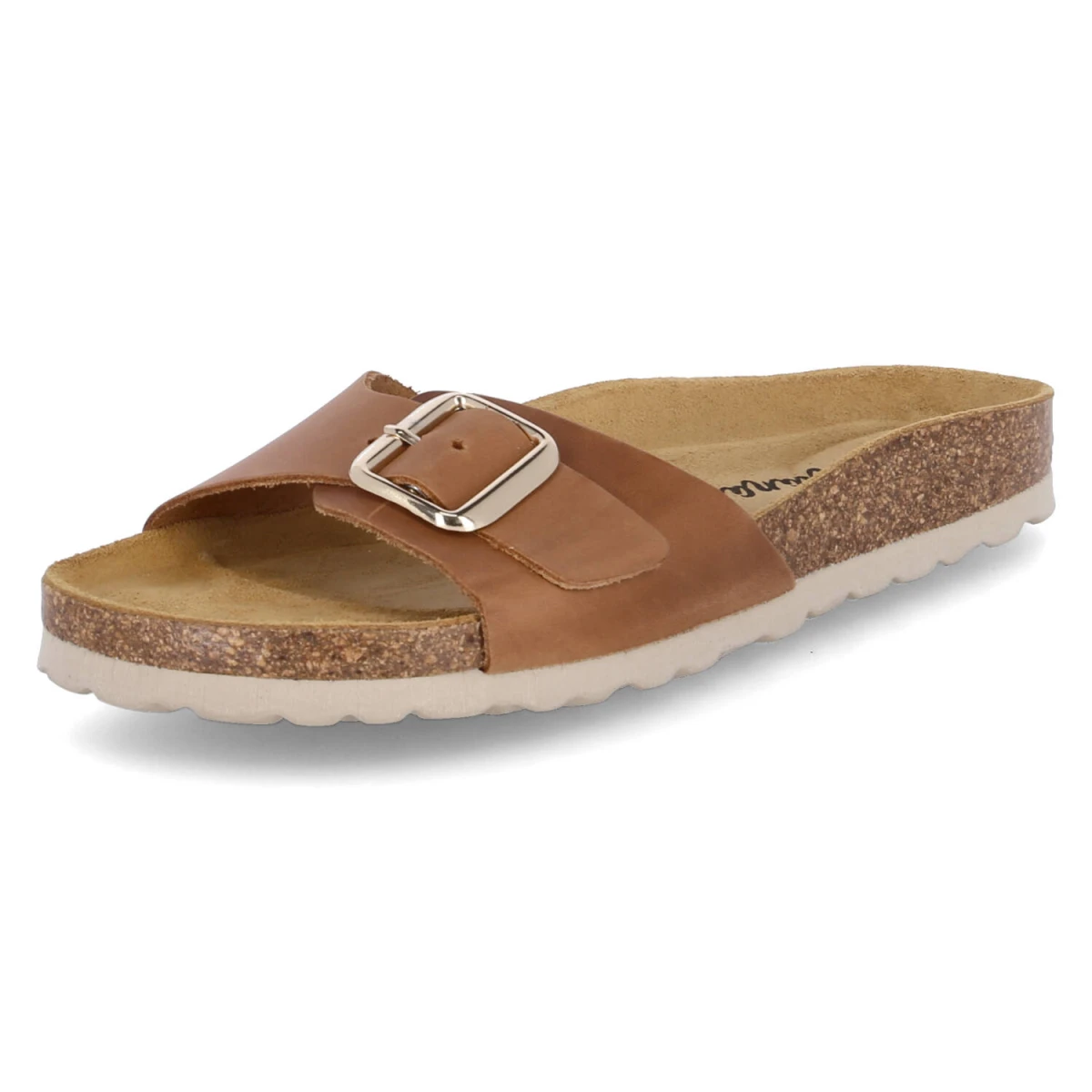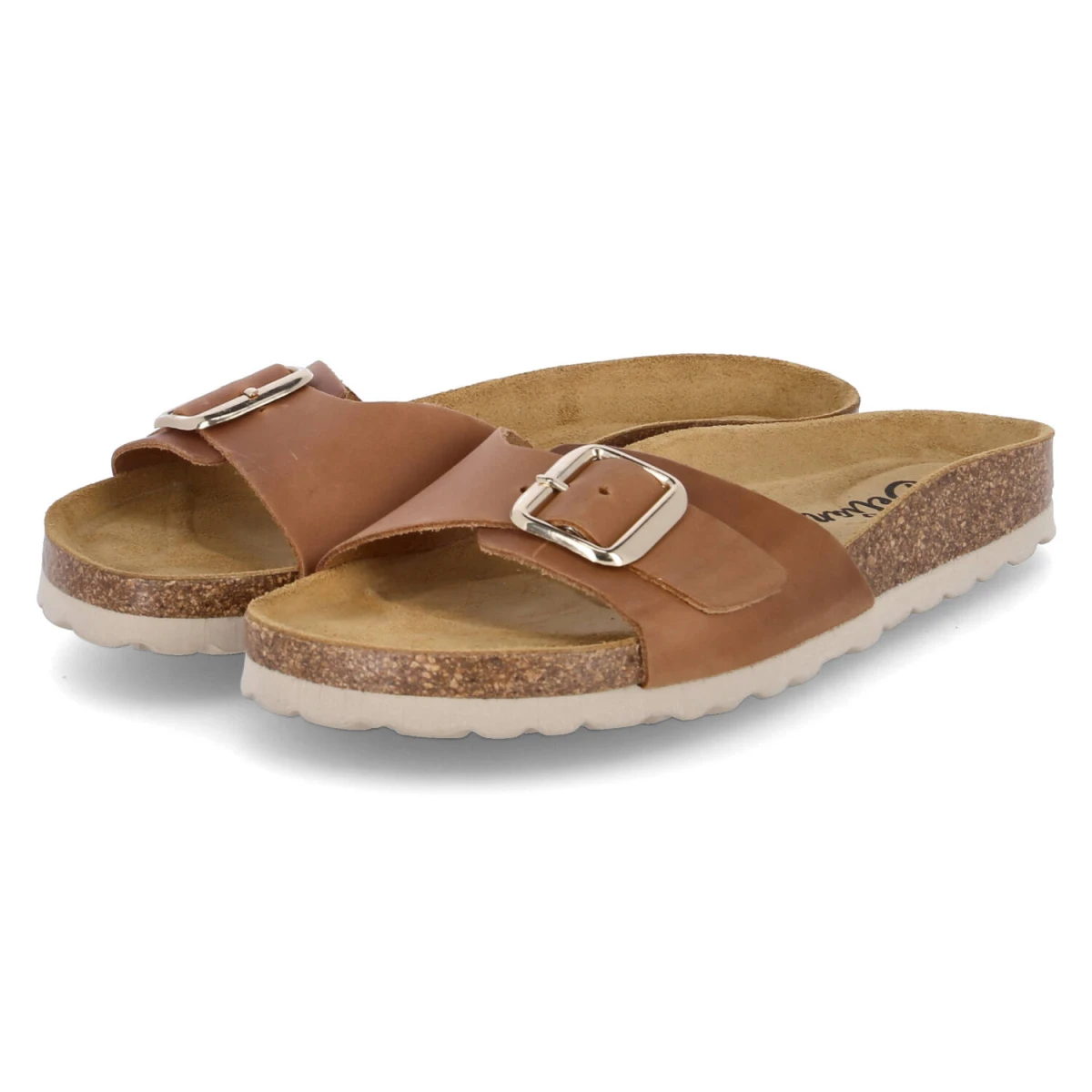 Diese Beliana Pantoletten setzen auf puren Komfort und subtile Raffinesse. Weiches Rauleder trifft auf einen justierbaren Riemen mit Schnalle in Goldoptik, der dem Design eine elegante Note verleiht. Das vorgeformte, weiche Kork-Tieffußbett mit Lederbezug und das gepolsterte Fußbett schaffen eine angenehme Basis für längere Wege. Dank profilierter EVA-Laufsohle überzeugt der Schuh mit leichtem Abrollen und gutem Grip, die offene Schuhspitze sorgt für sommerliche Frische. Robustes Echtleder unterstreicht die Wertigkeit und macht das Modell pflegeleicht und langlebig. Durch den warmen Braunton entstehen besonders gute Kombinationsmöglichkeiten von casual bis chic. Modetipp: Im monochromen Erdtöne-Look mit fließender Wide-Leg-Hose und seidigem Top spielt die goldene Schnalle ihren glamourösen Akzent aus.