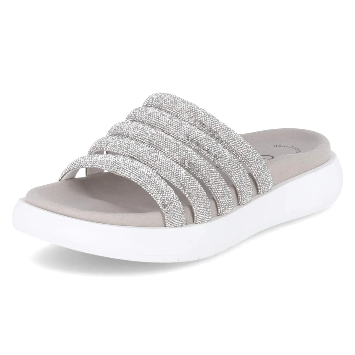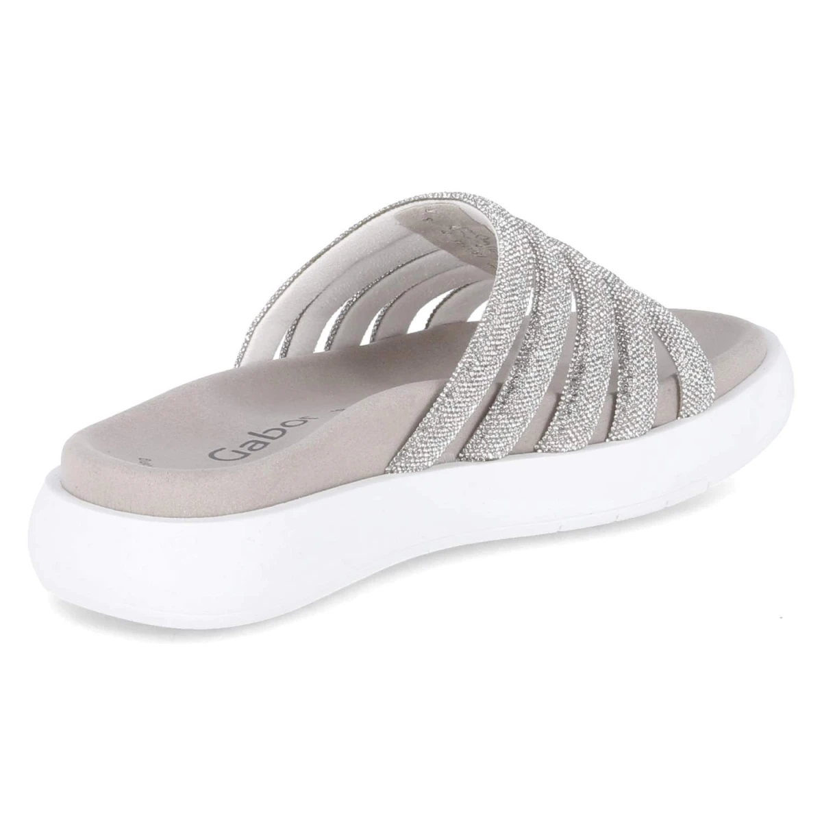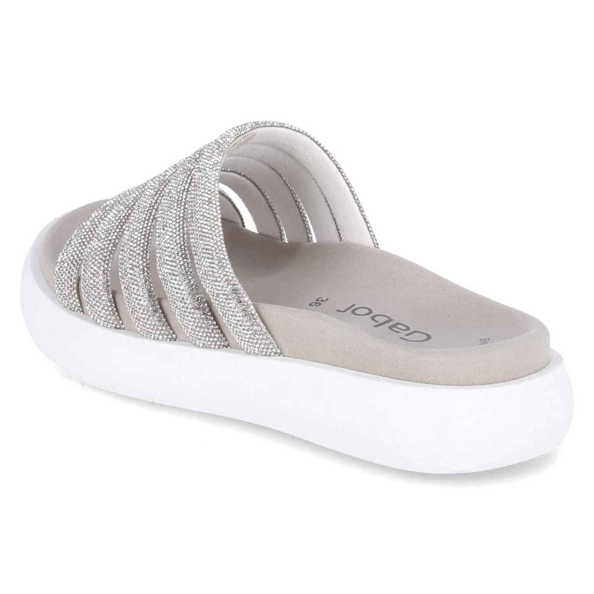 Fünf strahlende Riemchen mit feinem Strassbesatz prägen den eleganten Charakter dieser silbernen Gabor Pantoletten. Die glitzernde Oberfläche verleiht dem schlichten Slip-on-Design ohne Verschluss eine festliche Note, ideal für Events, Stadtbummel oder Dinner-Abende. Ein gepolstertes Tieffußbett unterstützt angenehmen Laufkomfort, die weiche Decksohle aus Textil schmiegt sich sanft an. Die robuste, rutschfeste Laufsohle bietet guten Grip, die offene Spitze unterstreicht die sommerliche Leichtigkeit. Mit normal ausfallender Passform gelingt die Größenwahl unkompliziert. Für den perfekten Auftritt verbindet das Modell Stil und Bequemlichkeit auf ansprechende Weise. Modetipp: Mit Satintop, Cropped-Blazer und weiten Stoffhosen entsteht ein moderner Abendlook; tagsüber mit Denim-Shorts und Seidentuch wirkt der Glamour casual.