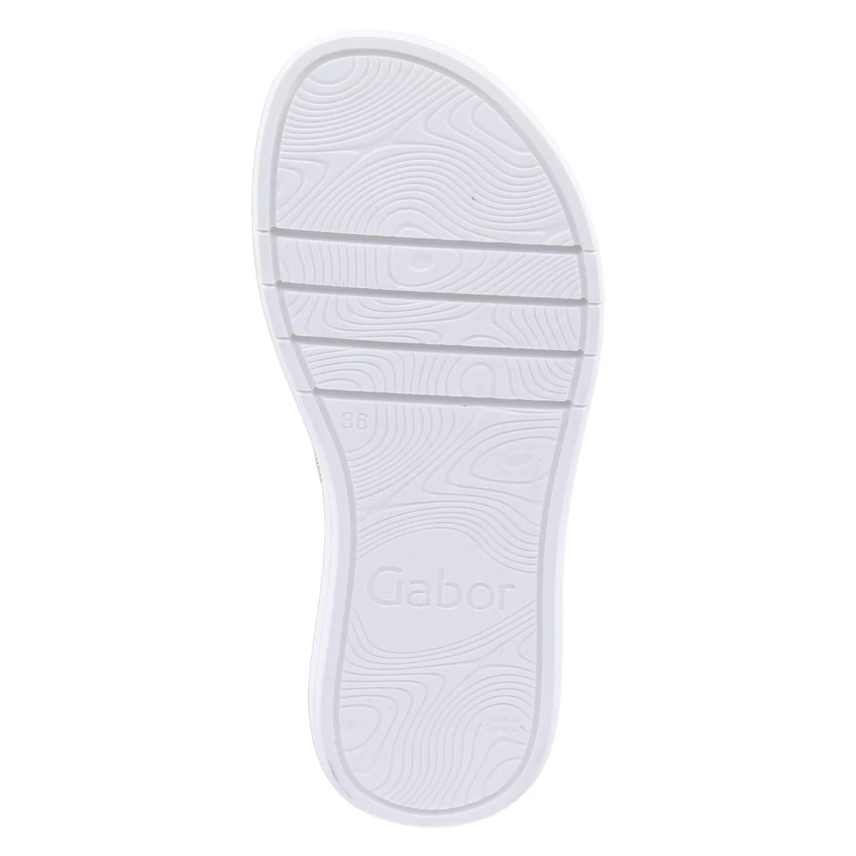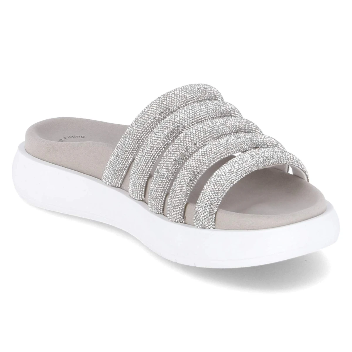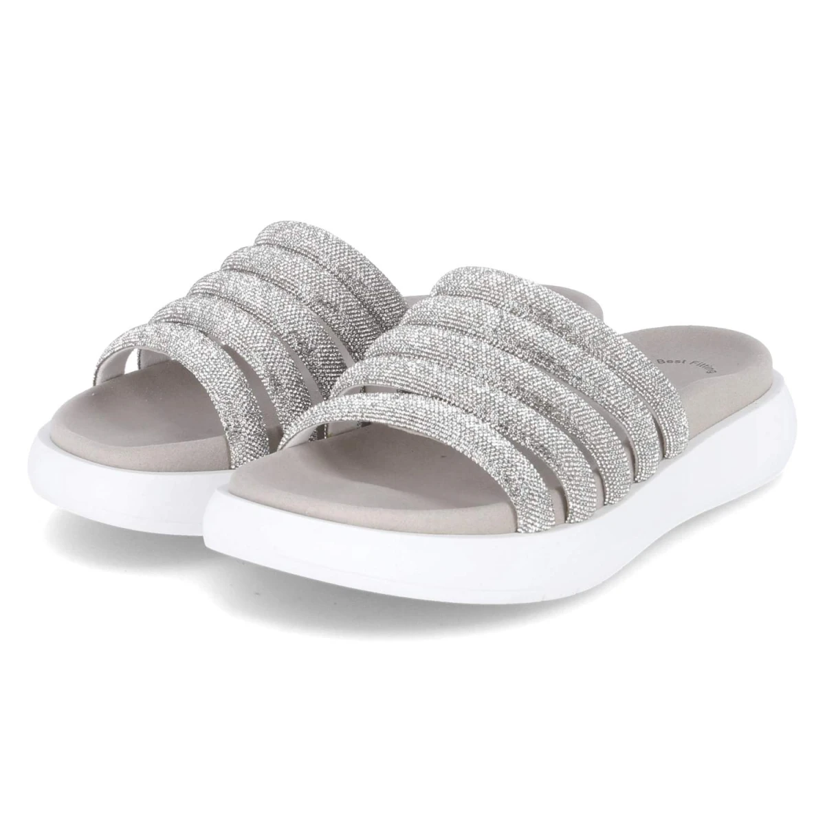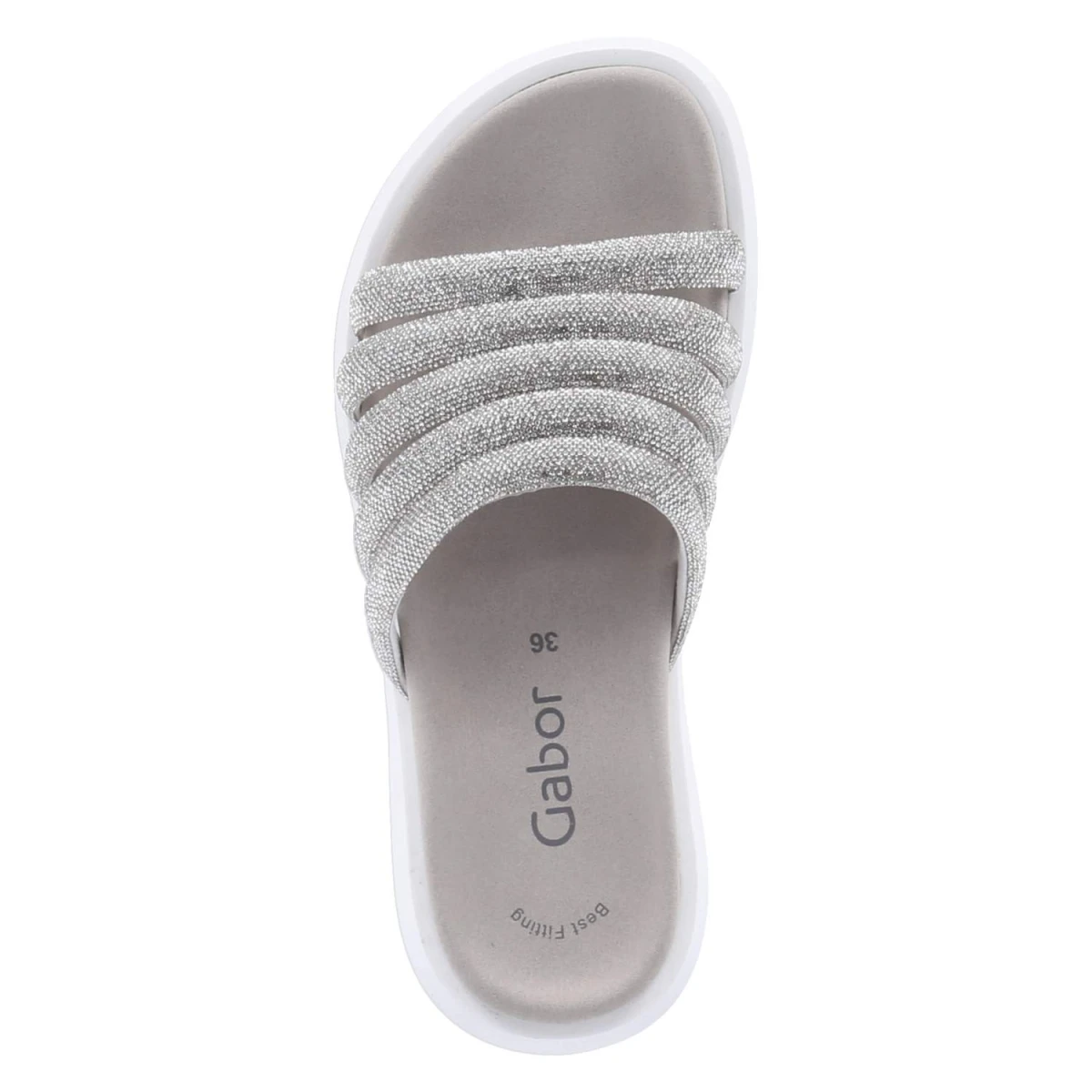 Fünf strahlende Riemchen mit feinem Strassbesatz prägen den eleganten Charakter dieser silbernen Gabor Pantoletten. Die glitzernde Oberfläche verleiht dem schlichten Slip-on-Design ohne Verschluss eine festliche Note, ideal für Events, Stadtbummel oder Dinner-Abende. Ein gepolstertes Tieffußbett unterstützt angenehmen Laufkomfort, die weiche Decksohle aus Textil schmiegt sich sanft an. Die robuste, rutschfeste Laufsohle bietet guten Grip, die offene Spitze unterstreicht die sommerliche Leichtigkeit. Mit normal ausfallender Passform gelingt die Größenwahl unkompliziert. Für den perfekten Auftritt verbindet das Modell Stil und Bequemlichkeit auf ansprechende Weise. Modetipp: Mit Satintop, Cropped-Blazer und weiten Stoffhosen entsteht ein moderner Abendlook; tagsüber mit Denim-Shorts und Seidentuch wirkt der Glamour casual.