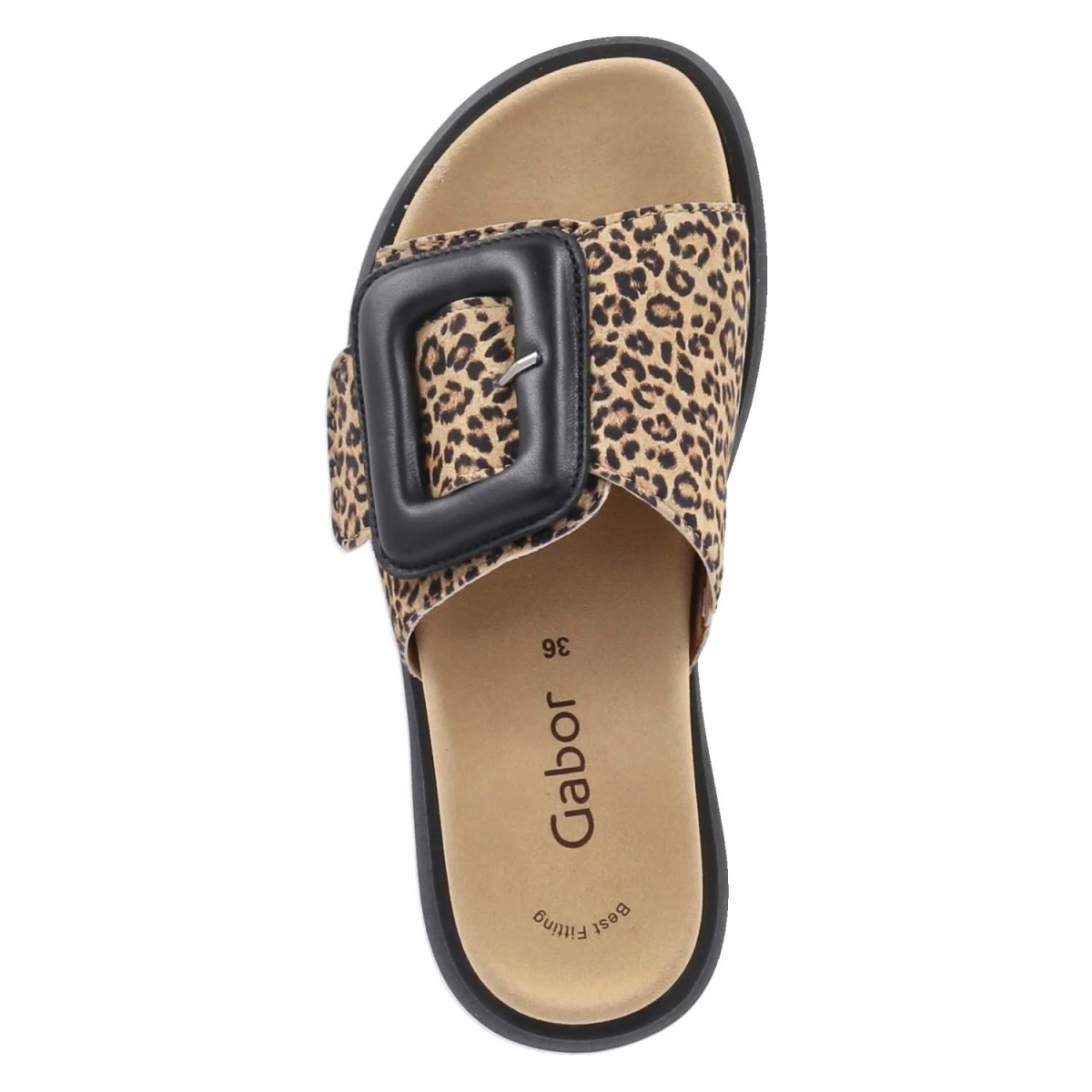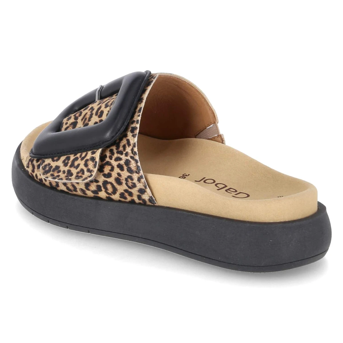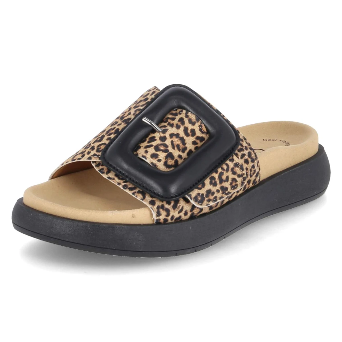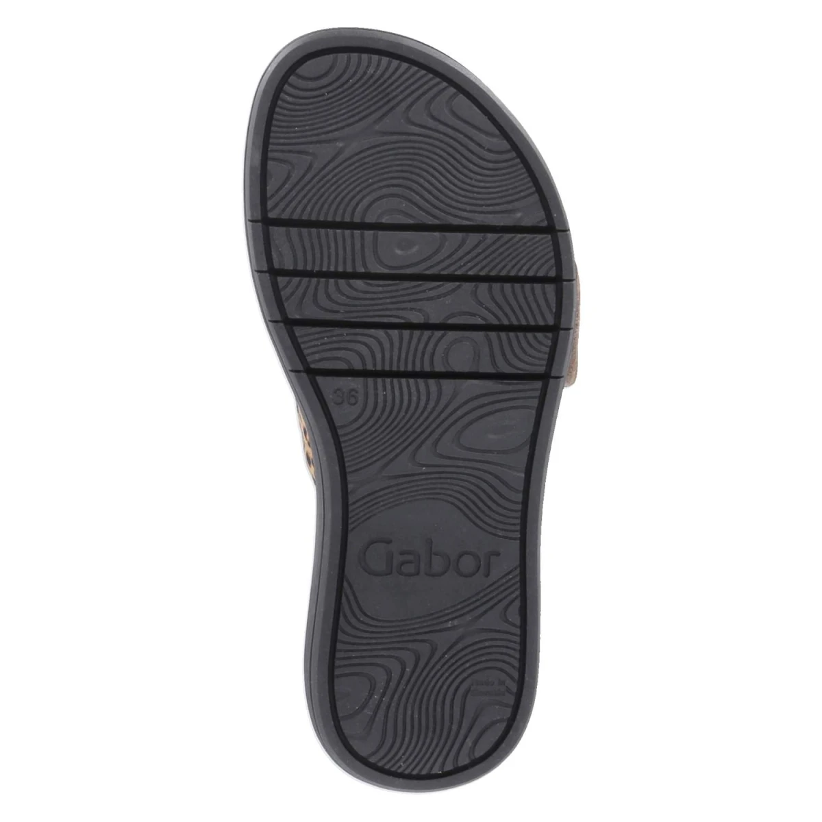 Zeitlos und modern zeigt sich diese Gabor Pantolette in Beige mit offener Spitze und markantem Animal Print im Leopard-Design. Das samtige Rauleder unterstreicht den hochwertigen Charakter, während der clevere Klettverschluss und ein elastischer Seiteneinsatz die Weite angenehm regulieren. Für Wohlempfinden sorgen eine vorgeformte Decksohle aus Textil und ein weich gepolstertes Tieffußbett, das die Fußsohle angenehm stützt. Die robuste, rutschfeste Laufsohle gibt ein sicheres Gefühl auf unterschiedlichen Untergründen. Das Modell fällt normal aus und richtet sich an erwachsene Damen, die Komfort und modische Raffinesse verbinden möchten. Modetipp: Zu monochromen Outfits in Creme oder Sand tragen, um den Leopard-Akzent in den Fokus zu rücken.