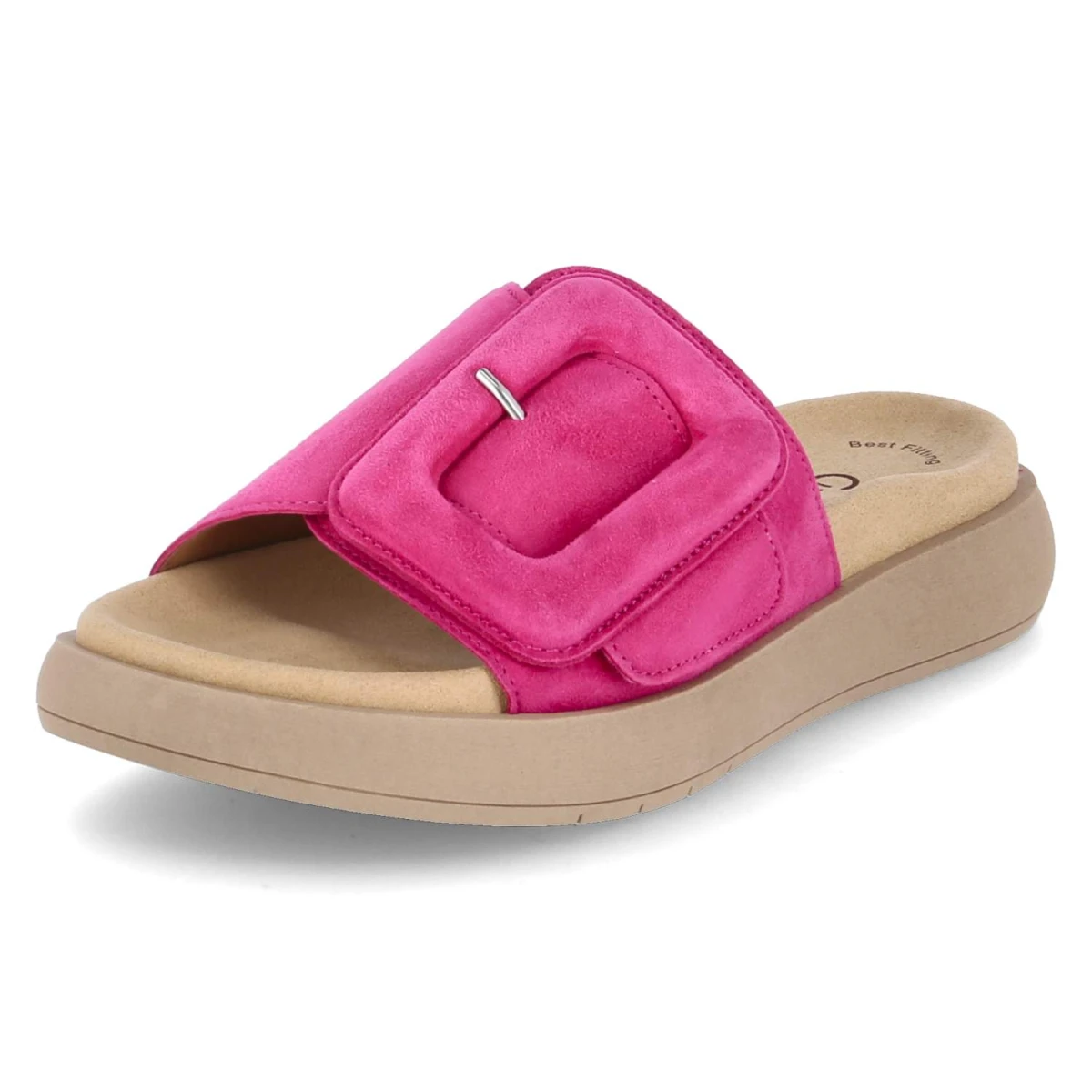 Diese Pantoletten von Gabor verbinden Alltagstauglichkeit mit einem Hauch Glamour. Das fein aufgeraute Rauleder zeigt eine sanft schimmernde, samtige Oberfläche, die offene Schuhspitze sorgt für sommerliche Leichtigkeit. Unter der markanten Zierschnalle verbirgt sich ein komfortabler Klettverschluss, ergänzt durch einen dezenten Elastikeinsatz an der Seite für optimale Passform. Die anatomisch vorgeformte Decksohle aus Textil und das gepolsterte Tieffußbett stützen gezielt und steigern den Komfort spürbar. Eine kräftige, rutschfeste Laufsohle garantiert Stabilität auf verschiedensten Untergründen. In der Größe fällt das Modell normal aus und harmoniert mit lässigen wie eleganten Outfits. Modetipp: Mit Paperbag-Shorts und gestreiftem Blazer entsteht ein smartes City-Set mit sportivem Twist.