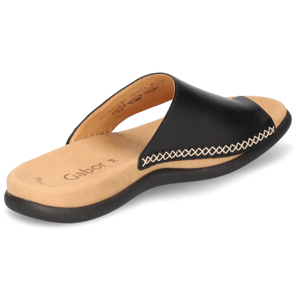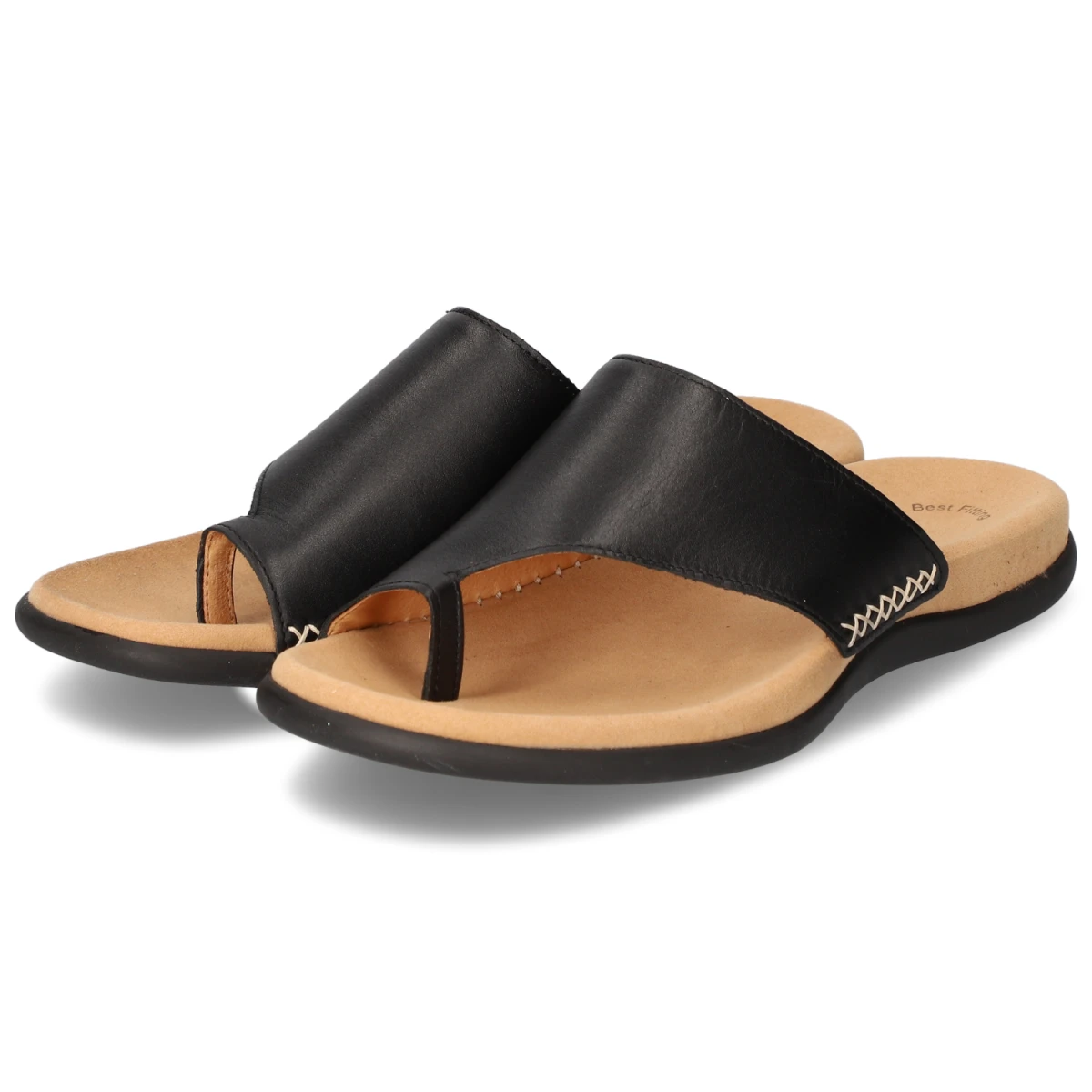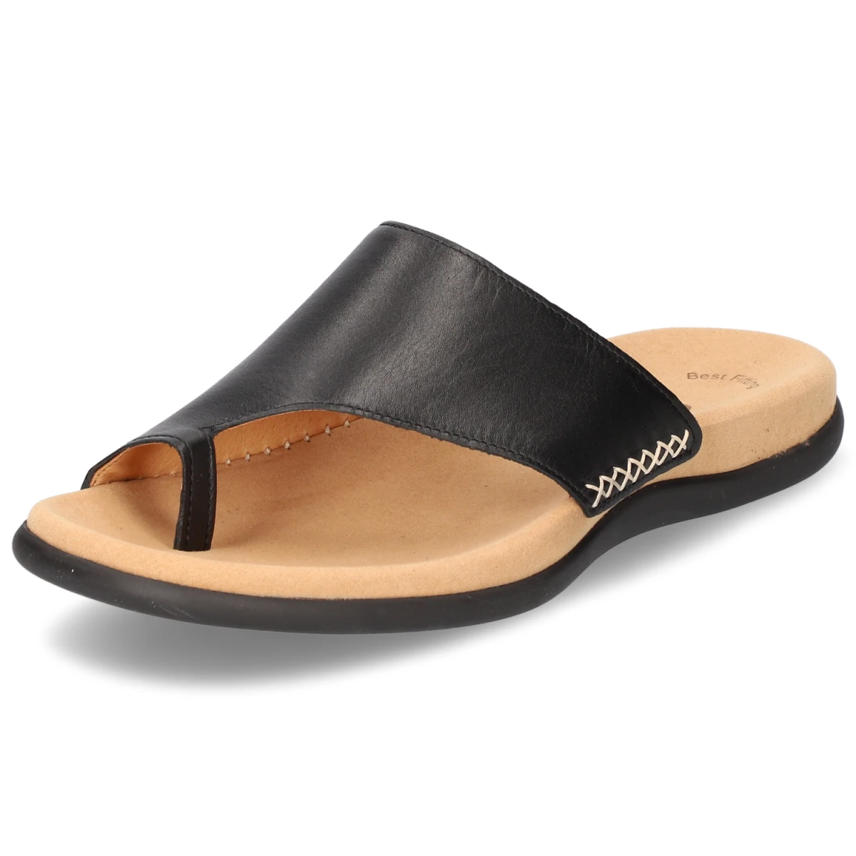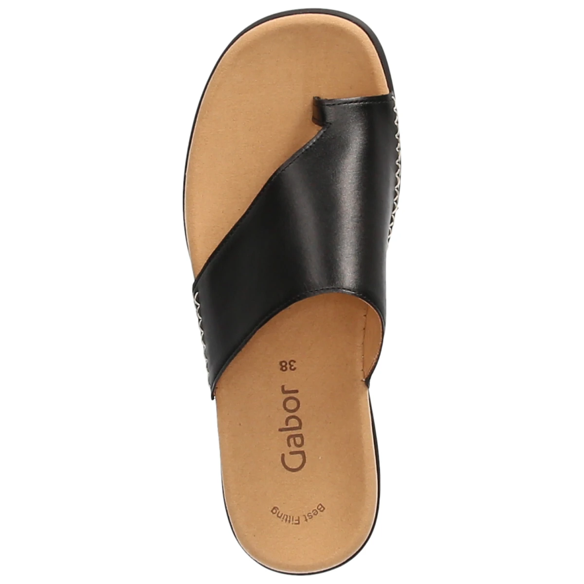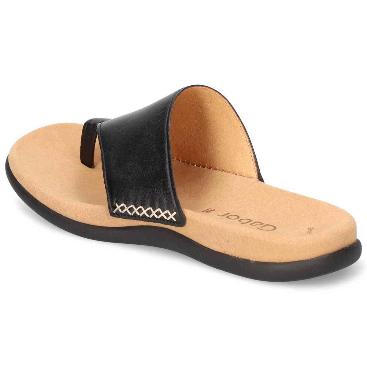 Schlicht, stilvoll und komfortorientiert präsentiert sich der Gabor Zehentrenner in klassischem Schwarz. Hochwertiges Glattleder in Echtleder-Qualität trifft auf eine weiche textile Decksohle und ein vorgeformtes, dämpfendes Fußbett, das den Fuß ideal unterstützt. Die flexible, griffige Laufsohle vermittelt Trittsicherheit, die offene Zehenpartie sorgt für Leichtigkeit im Sommer. Ein zierender Kreuzstich an der Seite betont die sorgfältige Verarbeitung. Das elegante Erscheinungsbild fügt sich mühelos in Urlaubsgarderobe, Alltagslooks und smarte Freizeit-Outfits ein. Durch den normalen Größenlauf lässt sich die gewohnte Größe wählen. Modetipp: Mit Denim-Shorts, lockerem Oversize-Hemd und Ledergürtel entsteht ein moderner, reduzierter Stil mit hochwertiger Note.