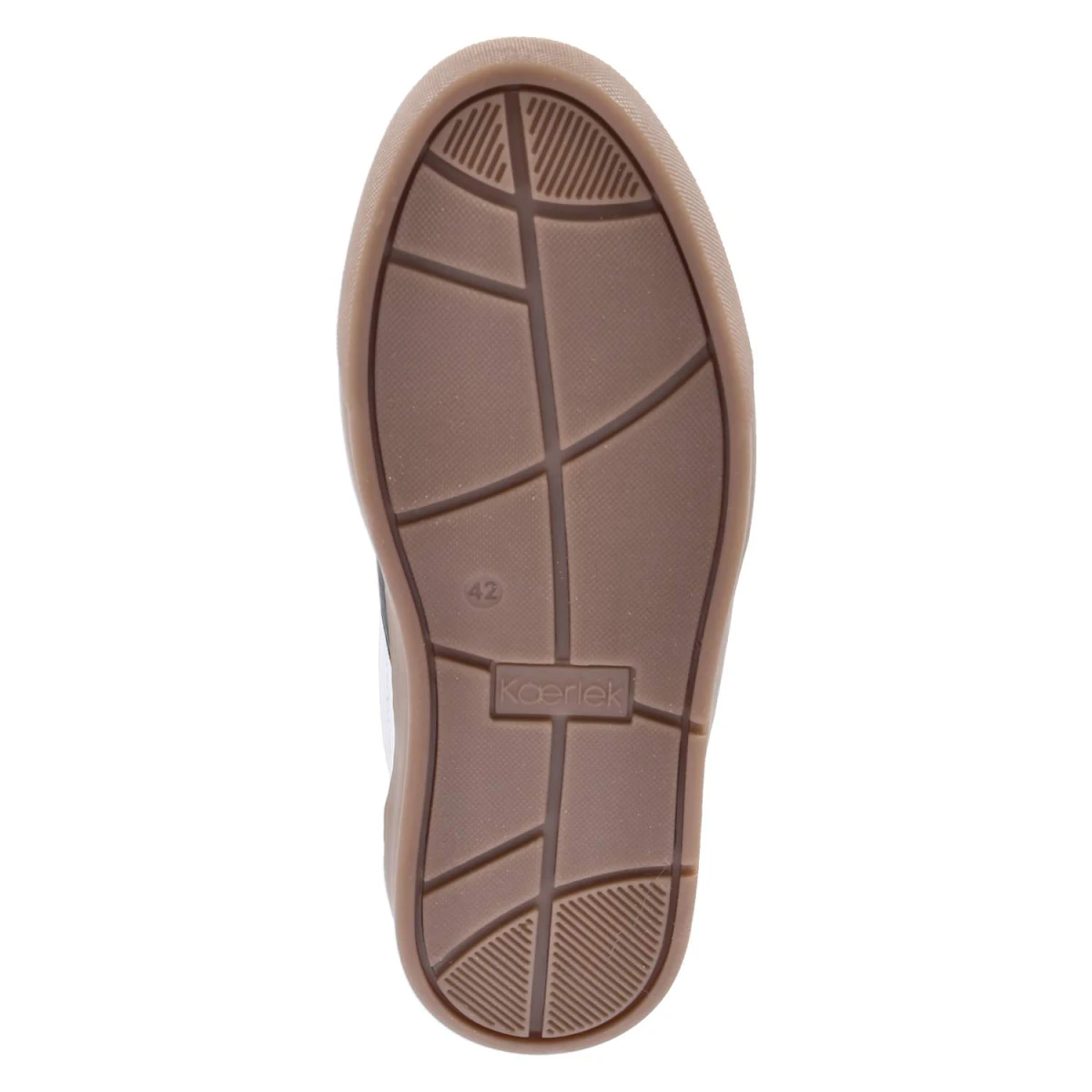 Dieser Low Sneaker von Kaerlek übersetzt sportliche Wurzeln in einen klaren, alltagstauglichen Look. Feines Glattleder legt sich robust und zugleich geschmeidig an den Fuß, die runde Kappe und die verstärkten Partien schützen in stark beanspruchten Zonen. Ein weich gepolsterter Schaftrand steigert den Tragekomfort, während die traditionelle Schnürung präzise Anpassung ermöglicht. Unterfoot liefert das gepolsterte, mit Leder bezogene Wechselfußbett angenehme Dämpfung und die Option zum Austausch. Die flexible, griffige Laufsohle gibt Halt auf Asphalt und glatten Böden. Markante schwarze Seitenstreifen verweisen auf das Retrodesign und schaffen eine klare Linie, die vielfältige Looks unterstützt; der Fit gilt als normal. Modetipp: Mit lockerem Leinenhemd und dunkelblauer Anzughose entsteht ein moderner Casual-Friday-Style.