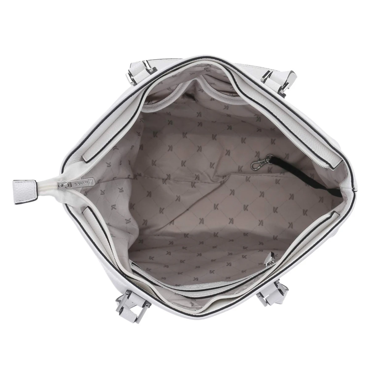 Eleganz und Organisation in perfekter Balance: Der weiße Shopper schafft mit ca. 28 x 32 x 12 cm und einem Volumen von etwa 10 Litern verlässlichen Stauraum, ohne an Leichtigkeit einzubüßen. Das Reißverschlusshauptfach hält Wertgegenstände sicher, hinten ergänzt ein Reißverschlussfach den schnellen Zugriff. Innen überzeugen ein weiteres Reißverschlussfach, zwei Steckfächer, zwei Stiftplätze und ein Schlüsselband mit Karabiner als aufgeräumtes System. Feste Henkel von ca. 60 cm Länge bieten komfortables Tragen über der Schulter, der verstärkte Boden mit Metallfüßchen stabilisiert die Form und schützt bei Abstellen. Das klare Weiß harmoniert von Frühling bis Winter mit vielfältigen Stoffen und Texturen. Modetipp: Mit dunklem Denim, gestreiftem Shirt und Loafern kombinieren, um einen smarten, maritimen Kontrast zu setzen.