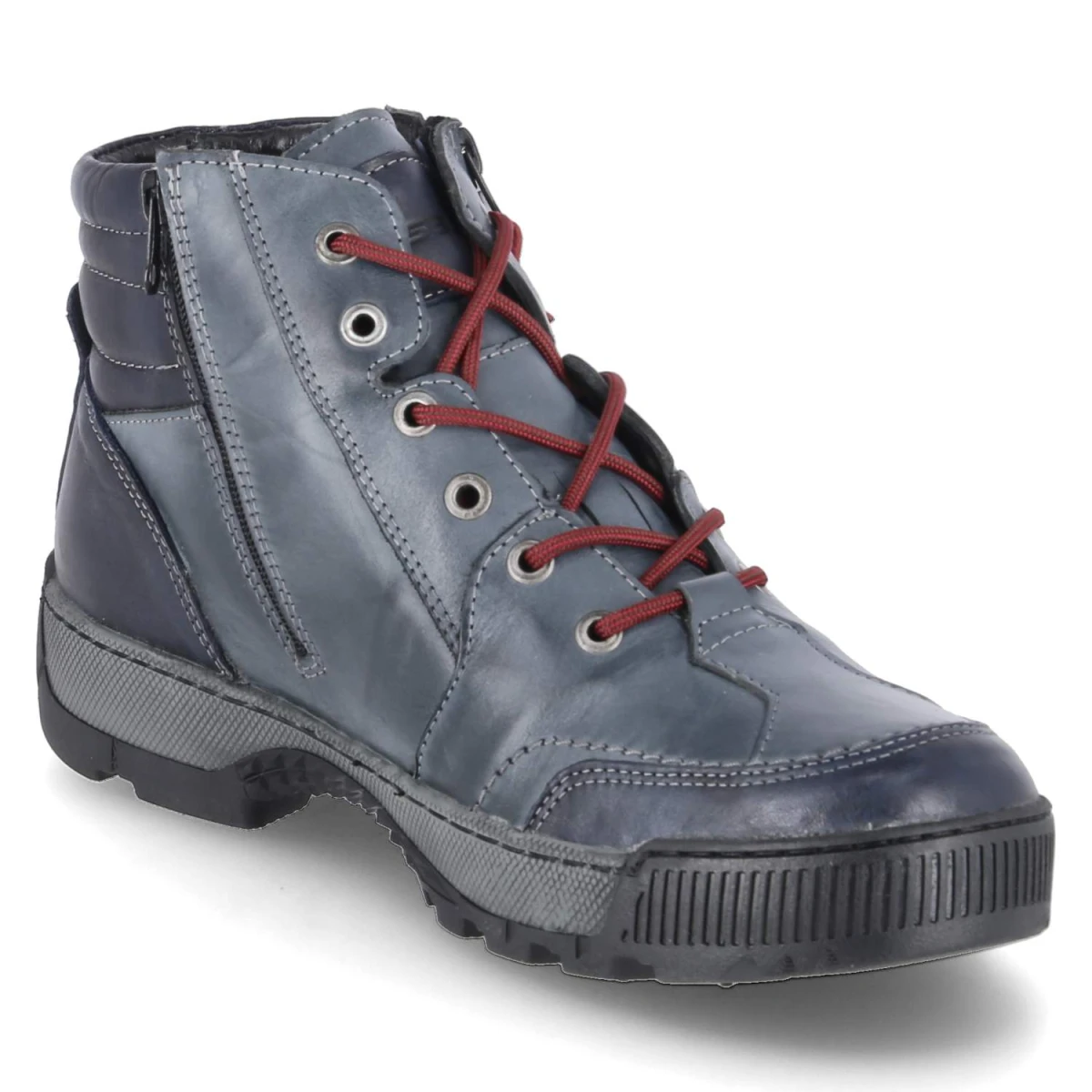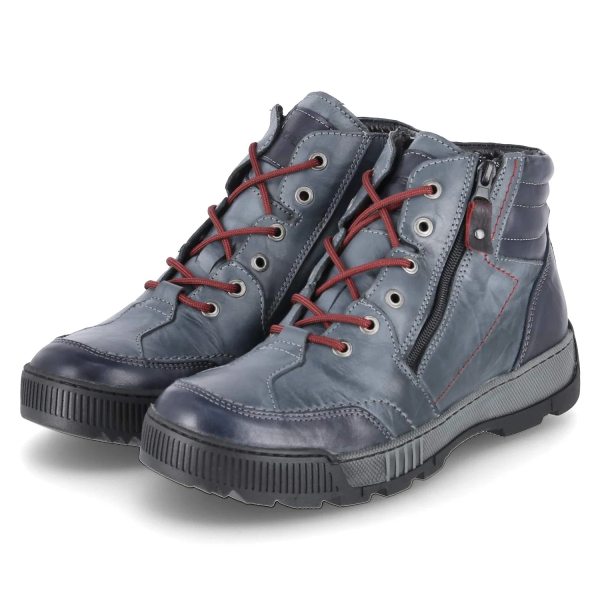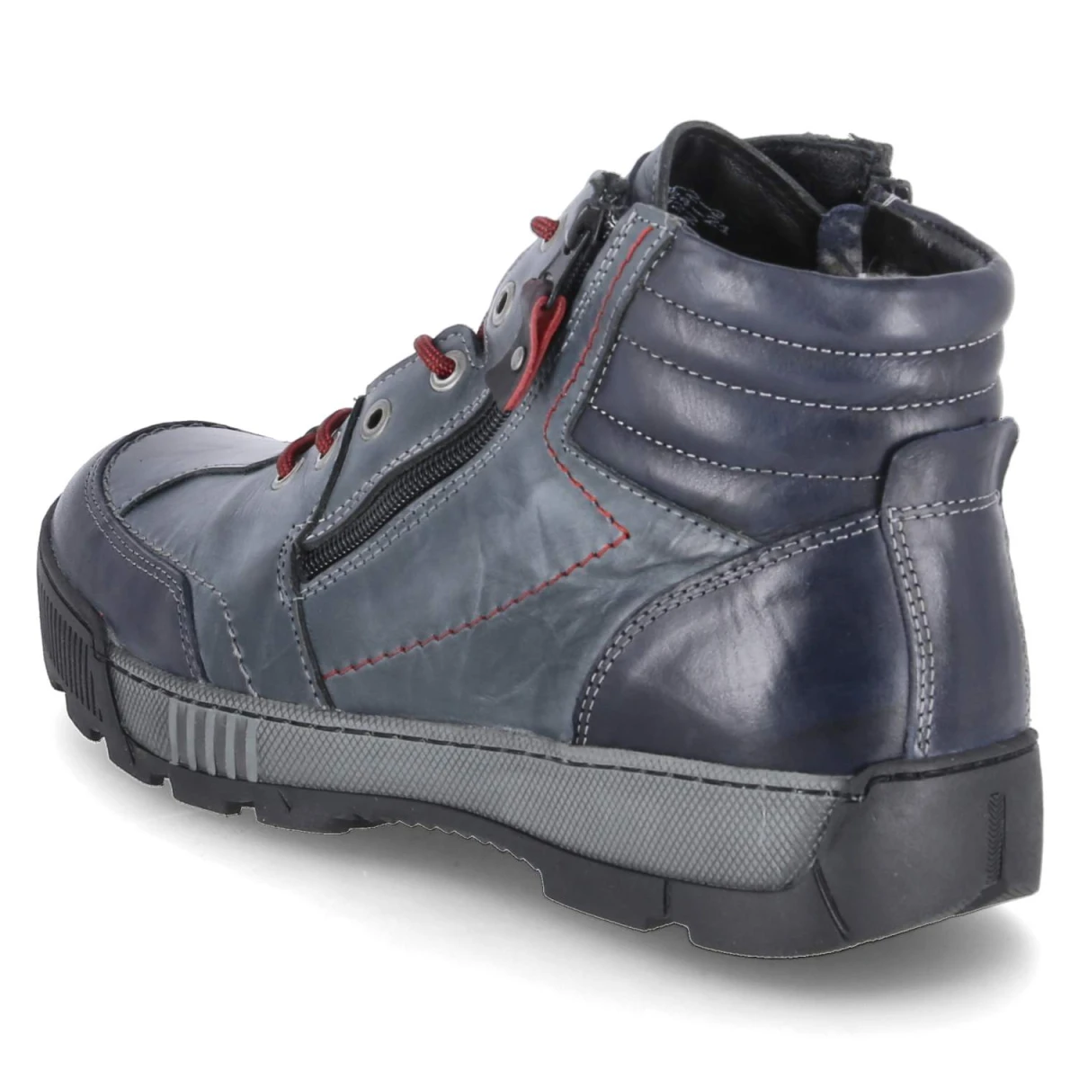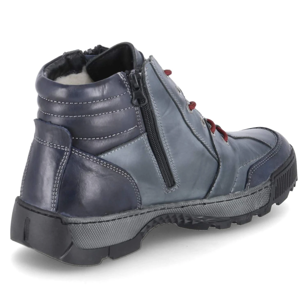 Diese Krisbut Winterboots verbinden kernige Optik mit Komfort. Glattes, robustes Echtleder in Blau erhält durch den Used-Look und feine seitliche Prägungen eine lässige Note. Innen hält ein Warmfutter zuverlässig warm, unterstützt von einer Textil-Decksohle und einem komfortabel gepolsterten Fußbett. Die runde Spitze, Zehen- und Fersenkappe sowie die flexible Profilsohle bieten Schutz und sicheren Tritt auf rutschigen Untergründen. Praktisch im Alltag: die Kombination aus Schnürung und zusätzlichem Reißverschluss. Die Passform fällt normal aus und eignet sich für Erwachsene, die Wert auf sportliche Details legen. Modetipp: Mit Flanellhemd, Wollcardigan und Raw-Denim entsteht ein authentischer Outdoor-Style.