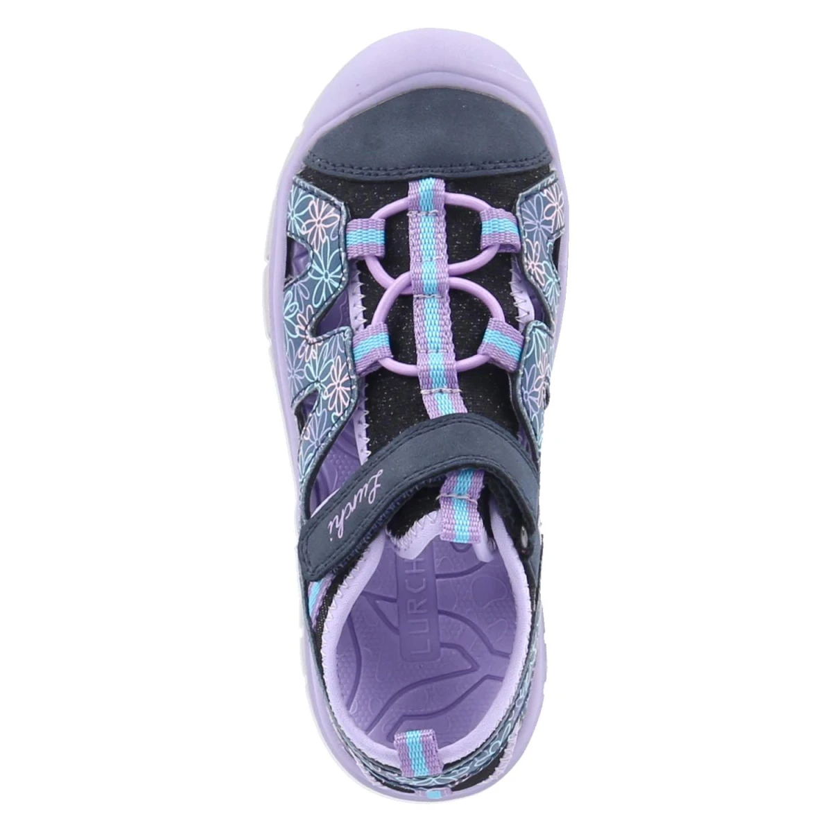 Robust und zugleich verspielt präsentieren sich die Lurchi Outdoorsandalen in lebendigem Lila. Der Material-Mix aus Textil und Synthetik verleiht Struktur, die bedruckten Partien und der seitliche Blumenprint bringen einen frischen Look. Für unbeschwerte Aktivitäten sorgt der geschlossene, runde Zehenbereich mit Schutzkappe, der kleine Zehen zuverlässig bewahrt. Komfort liefert das weiche Synthetikfußbett, das sich dank Wechselfunktion schnell entnehmen lässt - praktisch für das Einlegen eigener Einlagen. Ein bequemer Klettverschluss und ein Elastikband in Schnüroptik stellen eine passgenaue Fixierung sicher. Die flexible, rutschhemmende Profillaufsohle bietet guten Halt, der Größenhinweis fällt normal aus. Modetipp: Zu funktionalen Bermudas und einer leichten Kapuzenjacke entsteht ein lässiger Adventure-Style, der mit einem Haarband in Fliedertönen harmonisch akzentuiert wird.