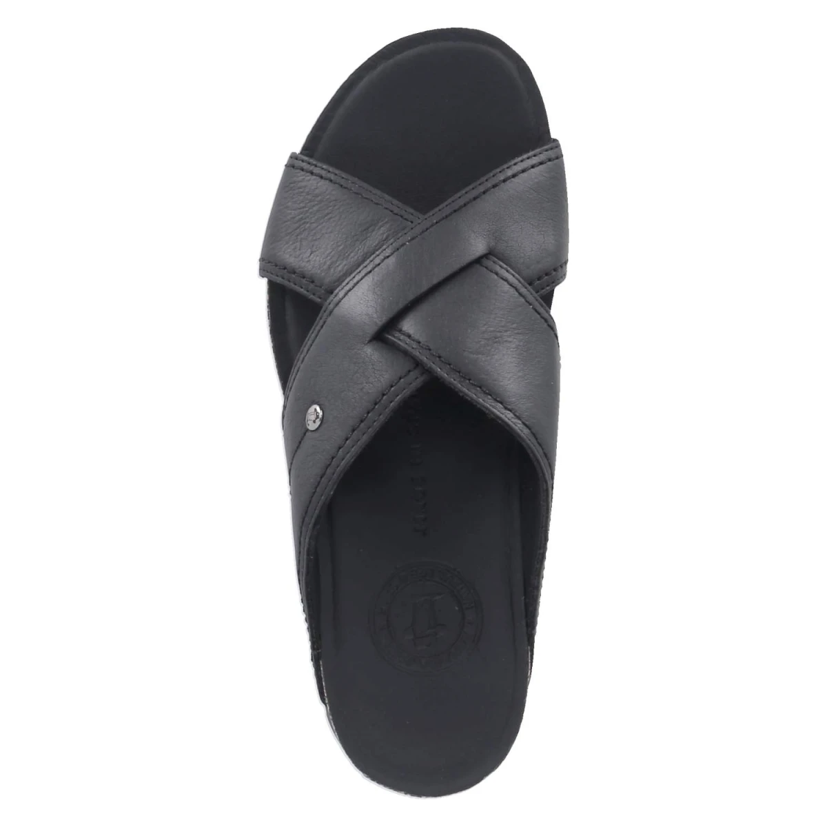 Als dezenter Allrounder setzt die Herren-Pantolette SALMAN von Panama Jack auf reduzierte Linien und robuste Materialien. Das schwarze Glattleder mit gekreuzten Riemen wirkt wertig, der metallene Button verleiht Understatement. Langlebiges Echtleder und ein atmungsaktives, hautfreundliches Lederfutter treffen auf ein vorgeformtes, gepolstertes Lederfußbett, das den Fuß angenehm führt. Offene Schuhspitze und flexible Profilsohle erhöhen Sommerkomfort und Trittsicherheit gleichermaßen. Dank normaler Passform bleibt die Wahl der Größe unkompliziert. Ob Urlaubspromenade oder Stadtbummel, das Modell überzeugt mit vielseitigen Kombinationsmöglichkeiten. Modetipp: Mit Denim-Shorts, lockerem Leinenhemd und einer Sonnenbrille entsteht ein moderner Resort-Look, der von einer Lederarmbanduhr stilvoll ergänzt wird.