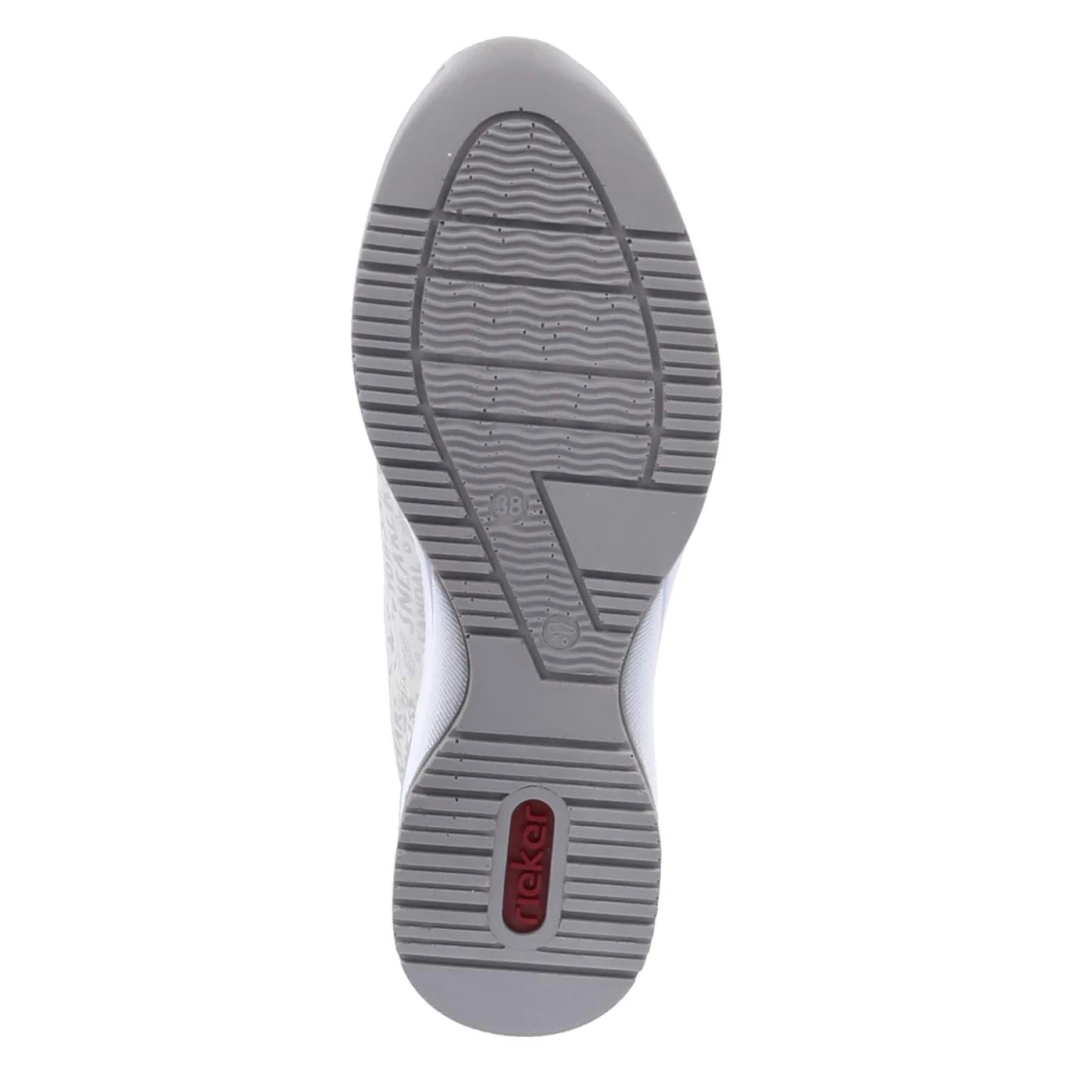 Sportiver Chic trifft auf feminine Note: Dieser Rieker Low Sneaker in Beige überzeugt mit bedrucktem Finish und subtil schimmerndem Silber-Print. Das synthetische Obermaterial in pflegeleichter Lederoptik ist alltagstauglich und formstabil, während Schnürung plus zusätzlicher Reißverschluss Funktion und Stil verbinden. Ein leicht gepolsterter Einstieg und das gepolsterte, herausnehmbare Lederfußbett verwöhnen den Fuß; die hautfreundliche Lederdecksohle unterstützt ein gutes Fußklima. Der verstärkte Zehen- und Fersenbereich bietet Schutz, die flexible, rutschhemmende Laufsohle sorgt für Grip. Mit 5 cm Keilabsatz entsteht eine komfortable Höhe, die die Silhouette streckt, ohne auf Bequemlichkeit zu verzichten. Die runde Spitze und die normale Passform machen den Sneaker zum unkomplizierten Allrounder. Mode-Tipp: Perfekt zu Midikleid in Offwhite und Jeansjacke für einen lässig-urbanen Look.