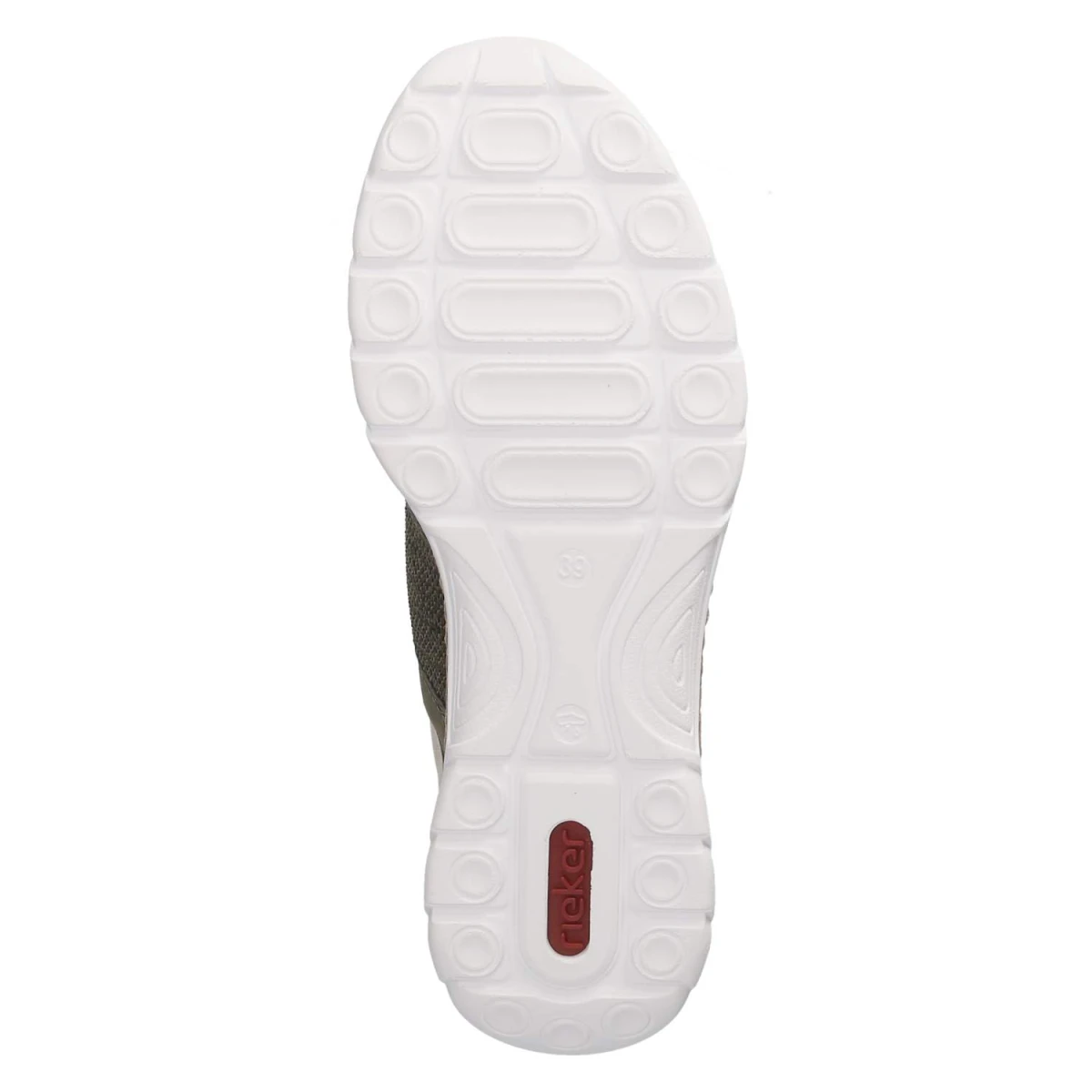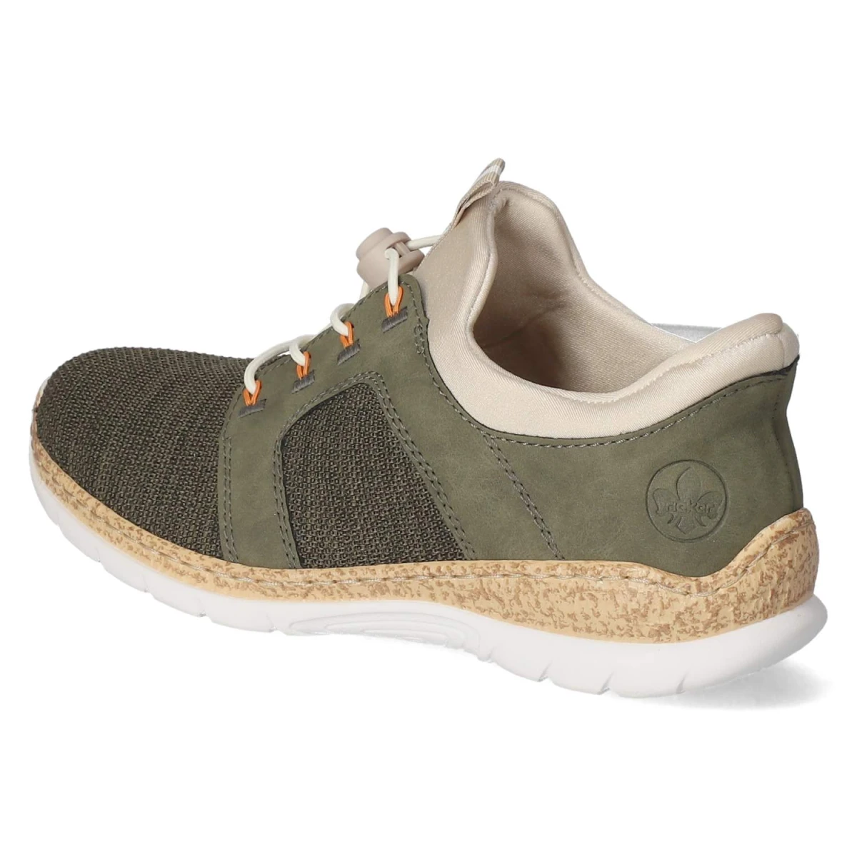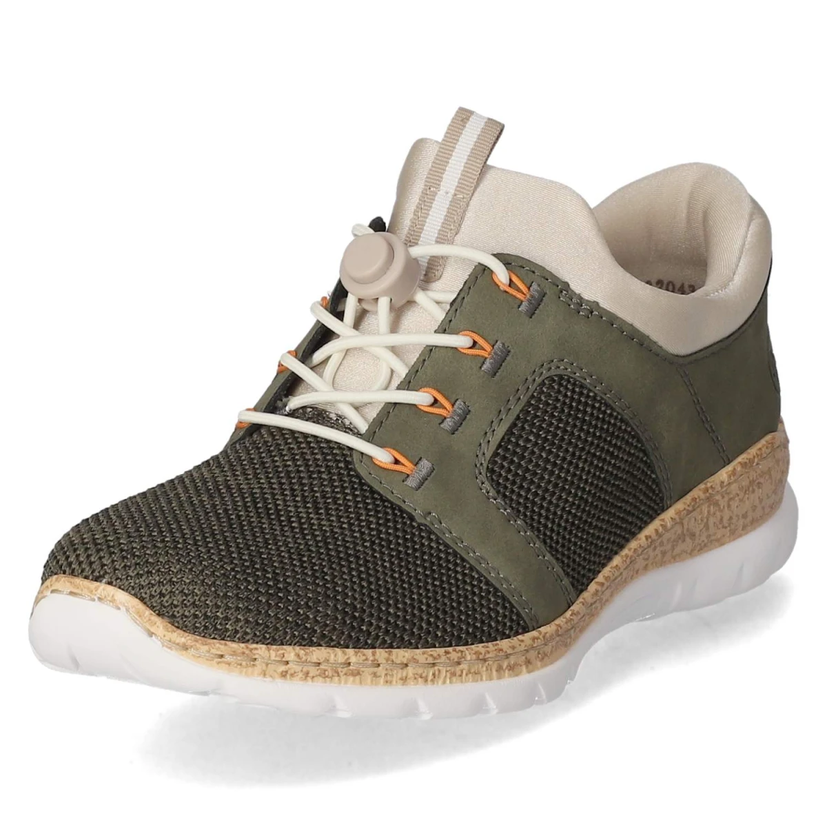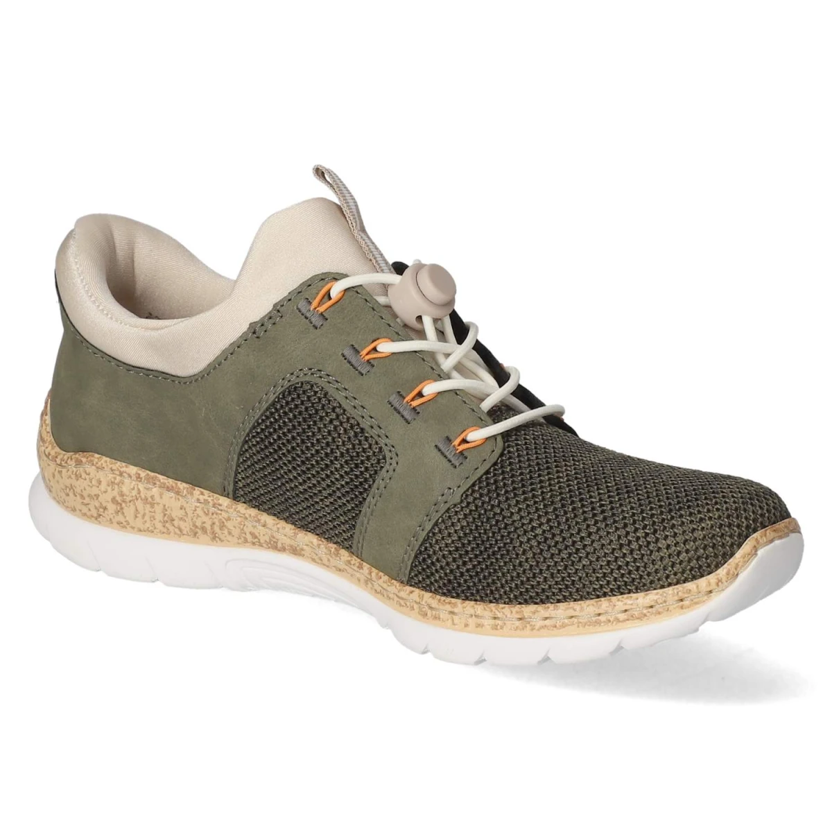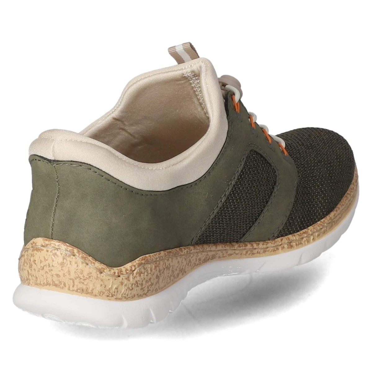 Leicht, unkompliziert und bereit für lange Wege: Der grüne Rieker Low Sneaker überzeugt mit geringem Gewicht und einer beweglichen Laufsohle, die den Fuß natürlich abrollen lässt. Das luftige Textilobermaterial mit Mesh-Elementen unterstützt ein angenehmes Fußklima, synthetische Besätze erhöhen Formstabilität und Langlebigkeit. Ein gepolsterter Einstieg, die softe textile Decksohle sowie das komfortable, gepolsterte Fußbett verwöhnen bei jedem Schritt, während die verstärkte Ferse sicheren Halt gibt. Mit Anziehlasche und Schnellverschluss gelingt der Einstieg im Handumdrehen. Die runde Schuhspitze bietet ausreichend Platz und unterstreicht den entspannten, lässigen Look. Das Modell fällt kleiner aus, entsprechend kann eine Zwischengröße oder die nächsthöhere Größe passend sein. Modetipp: Mit Cargo-Pants, geripptem Tank und einer leichten Bomberjacke entsteht ein urbaner Utility-Look, der das Grün pointiert aufgreift.