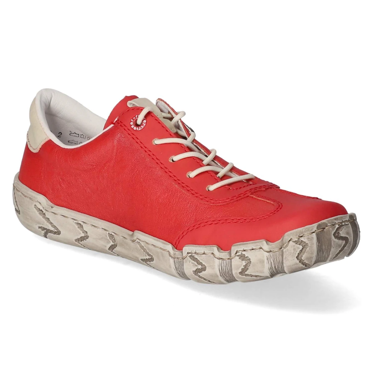 Ein vielseitiger Alltagsbegleiter: Der Rieker Slip On Sneaker in Rot kombiniert hochwertigen Leder-Synthetik-Mix mit funktionalen Details. Die runde Silhouette, beige Kontraste und subtile Logos verleihen dem Schuh eine urbane Note. Für Komfort sorgen ein weich gepolsterter Einstieg, ein gepolstertes Fußbett sowie eine Lederdecksohle, die ein angenehmes Klima im Schuh unterstützt. Der doppelte Komfortverschluss aus Schnürsenkeln und seitlichem Reißverschluss, ergänzt durch ein Elastikband, erleichtert das Handling und ermöglicht individuelles Anpassen. Verstärkte Zonen an Zehen und Ferse erhöhen die Haltbarkeit, während die flexible Laufsohle ein natürliches Abrollen fördert. Das Modell für Damen fällt normal aus und eignet sich für den täglichen Einsatz. Modetipp: Zu verkürzter, hell gewaschener Jeans und Trenchcoat entsteht ein zeitloser Look mit frischem Farbpunkt.