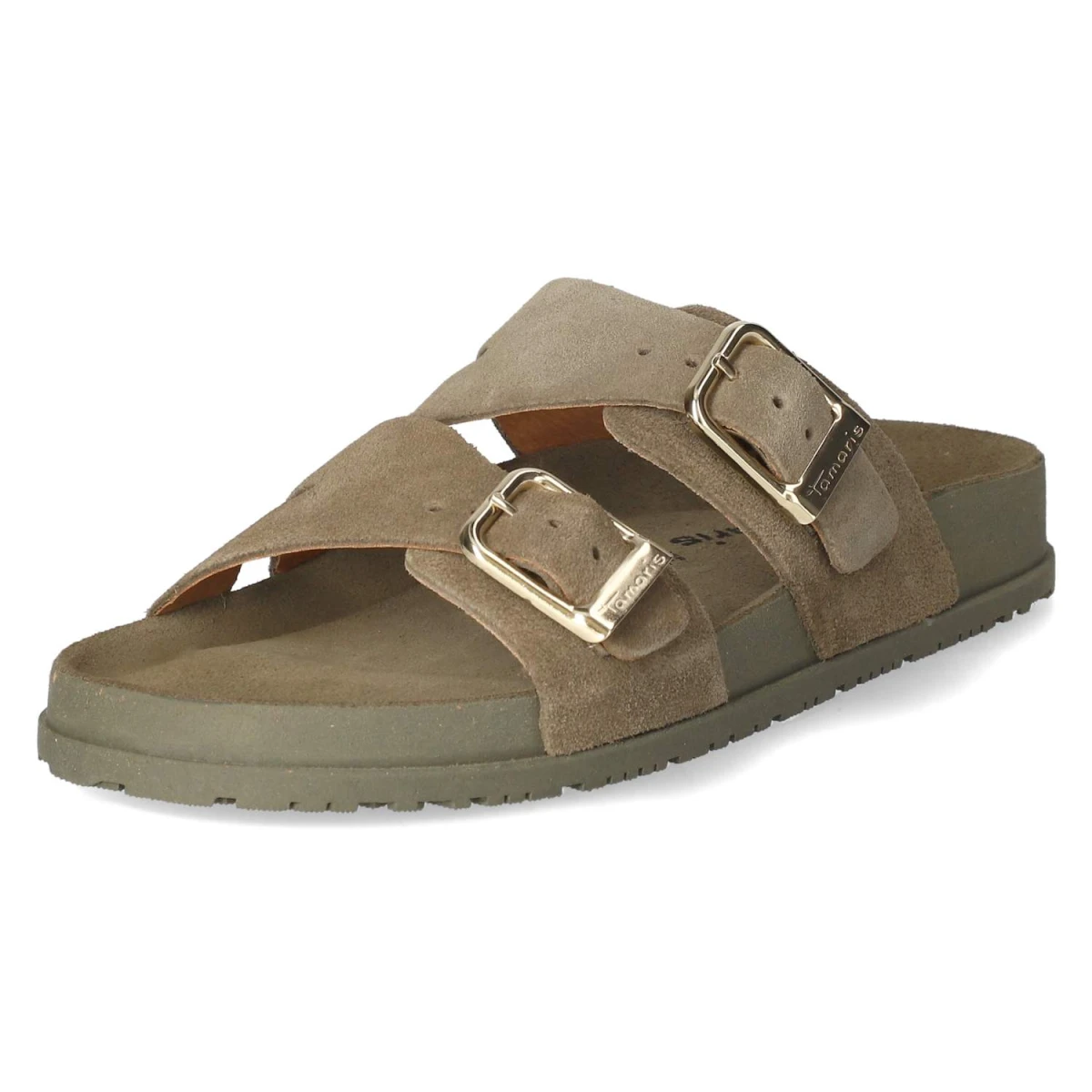 Mit klarer Formensprache und einem lebendigen Grünton bringen diese Tamaris-Pantoletten Sommerlaune in den Alltag. Weiches Rauleder trifft auf eine Decksohle aus atmungsaktivem Echtleder, die vorgeformte Kontur entlastet den Fuß bei jedem Schritt. Die flexible, rutschhemmende Laufsohle vermittelt ein sicheres Gefühl, während die Schnalle den Sitz verlässlich fixiert. Der offene Zehenbereich betont die leichte Ausstrahlung und macht das Modell zur unkomplizierten Wahl für warme Tage. Die Passform fällt normal aus und orientiert sich an den gewohnten Größen. Modetipp: Als Farbtupfer zu monochromen Outfits in Creme oder Schwarz stylen oder selbstbewusst mit floralen Prints aufgreifen - die grüne Nuance setzt ein modernes Fashion-Statement.